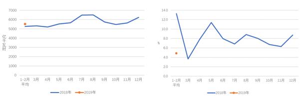 圖1 2018、2019年分月全社會(huì)用電量及其增速