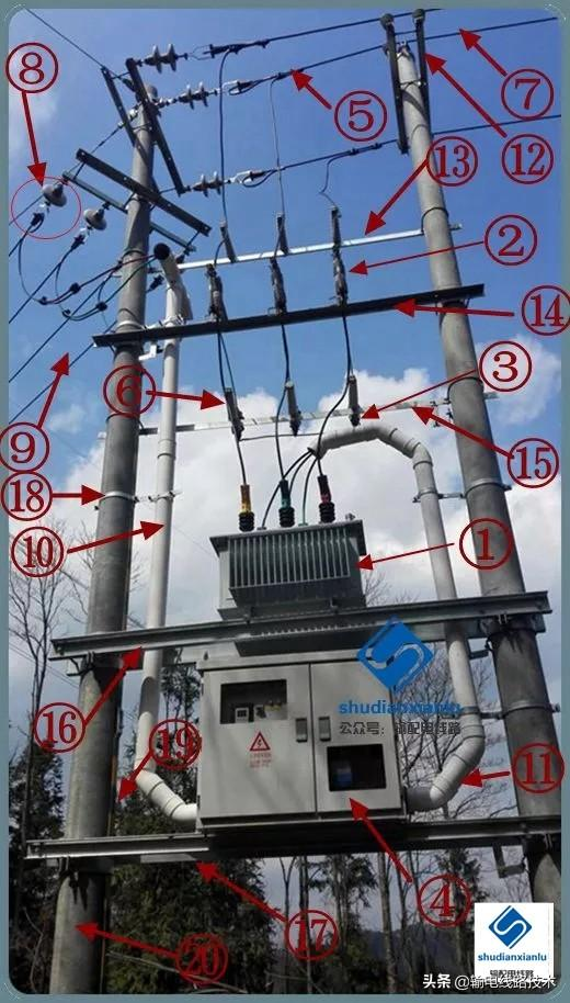 圖中除上面介紹的外還有變壓器臺擔抱箍、綜合配電箱臺擔抱箍、針式絕緣子、U型抱箍、M墊鐵、銅(鋁)端子、單(雙)頭螺栓、避雷器引下線、接地裝置、安健環標志、拉線系統、拉盤等。